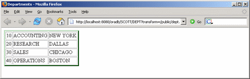 Зарегистрируем в качестве ресурса /public/dept.xsl следующий текст: <?xml version="1.0"?> <xsl:stylesheet version="1.0" xmlns:xsl="http://www.w3.org/1999/XSL/Transform" > <xsl:output method="html" /> <xsl:template match="ROW"> <tr> <td><xsl:value-of select="DEPTNO"/></td> <td><xsl:value-of select="DNAME"/></td> <td><xsl:value-of select="LOC"/></td> </tr> </xsl:template> <xsl:template match="DEPT"> <html><head></head><body><title>Departments</title> <table border="3" bordercolor="green"> <xsl:apply-templates select="ROW"/> </table> </body></html> </xsl:template> </xsl:stylesheet> Теперь обращение к XML DB по адресу: http://localhost:8080/oradb/SCOTT/DEPT?transform= даст следующий результат: Текст с определением преобразования XSLT можно разместить и в таблице БД, обратившись за ним опять-таки через DBURITYPE примерно так: transform=/oradb/SCOTT/XSLTDEFS/ROW[TAB='DEPT']/DEFINITION/text() Упражнение. Создать таблицу XSLTDEFS с определением преобразования XSLT для таблицы DEPT (столбец TAB для имени таблицы и столбец DEFINITION для текста преобразования) и указать сервлету взять данные преобразования оттуда, а не из ресурса XML DB. Указание: поле DEFINITION определить типом VARCHAR2. Прочие свойства сервлета приведены в документации по XML DB. Создание сервлета на JavaOracle XML DB поддерживает Java Servlet API версии 2.2 с некоторыми ограничениями, и с возможностью дополнительно установить сервлет поддержки JSP. Подготовим текст сервлета в файле XMLDBServlet.java: import java.io.PrintWriter;
