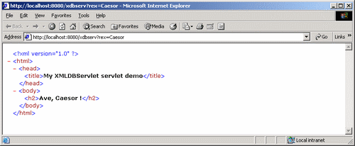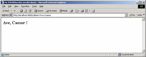 Пример ради общности рассматривает употребление суперкласса GenericServlet, а не HttpServlet. Загрузим сервлет в БД одним из возможных способов: >loadjava -grant public -u scott/tiger -r XMLDBServlet.java Проверкой легко убедиться, что СУБД не только загрузит в БД исходный текст, но и получит из него класс. Чтобы сервлет мог вызываться извне, сведения о нем требуется занести в ресурс-файл /xdbconfig.xml в репозитарии XML DB. Это файл с «объектно-реляционным» храненнем, и подправить его можно либо через WebDAV (системами, обеспечивающими такую правку), либо обычными функциями UPDATEXML и прочими. (Именно этот файл не допускает удаления из репозитария, поэтому выгрузить его, подправить и загрузить заново невозможно). Однако при желании, для удобства правки файла /xdbconfig.xml можно использовать специально созданые для этого подпрограммы пакета DBMS_XDB. Выполним в SQL*Plus от имени пользователя XDB: DECLARE xval XMLTYPE; xnode1 XMLTYPE := XMLTYPE ( ' <servlet xmlns="http://xmlns.oracle.com/xdb/xdbconfig.xsd"> <servlet-name>XMLDBServletPrimer</servlet-name> <servlet-language>Java</servlet-language> <display-name>Oracle XML DB Servlet Primer</display-name> <servlet-class>XMLDBServlet</servlet-class> <servlet-schema>SCOTT</servlet-schema> </servlet> '); xnode2 XMLTYPE := XMLTYPE ( ' <servlet-mapping xmlns="http://xmlns.oracle.com/xdb/xdbconfig.xsd"> <servlet-pattern>/xdbserv</servlet-pattern> <servlet-name>XMLDBServletPrimer</servlet-name> </servlet-mapping> '); BEGIN SELECT DBMS_XDB.CFG_GET ( ) INTO xval FROM dual; SELECT INSERTCHILDXML ( xval, '/xdbconfig//servlet-list', 'servlet', xnode1 ) INTO xval FROM dual ; SELECT INSERTCHILDXML ( xval, '/xdbconfig//servlet-mappings', 'servlet-mapping', xnode2 ) INTO xval FROM dual ; DBMS_XDB.CFG_UPDATE ( xval ); COMMIT; END; / Теперь обращение по адресу: http://localhost:8080/xdbserv?rex=Caesor даст результат: Выдача данных в формате HTML и обращение к БД делается как обычно. Например, для перехода к HTML в данном случае даже необязательно пользоваться классом HttpServlet. Достаточно в описании сервлета заменить text/xml на text/html и изъять строку out.println ( "<?xml version=\"1.0\"?>" );. Перетранслировав сервлет, получим по тому же адресу: Обращение в тексте сервлета к данным БД делается как обычно для Java, и оставляется для самостоятельного упражнения. |