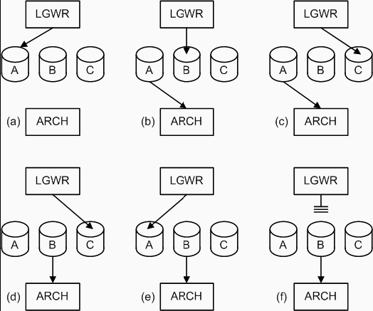 LGWR переключился на файл C, в то время как ARCH еще не обработал A. В эпизоде (d) ARCH