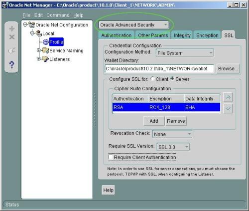 В противном случае программа предложит текст заявки на получение сертификата, что пока не нужно. Свойство бумажника Auto Login в Wallet Manager нужно будет задать самостоятельно. Следует обратить внимание, чтобы места нахождения файлов бумажников были доступны элементам ПО соответственно сервера и клиента. Защищенные соединения с СУБД по протоколу SSLПО Oracle Advanced Security позволяет проводить авторизацию соединений клиента с сервером средствами сторонних продуктов, таких как Kerberos или RADIUS. Здесь же будет показано, как это можно сделать с использованием бумажника и техники защищенного соединения SSL (более современное название - TLS, http://en.wikipedia.org/wiki/Transport_Layer_Security). С SSL связано и иное решение: соединяться в Oracle без Advanced Security, но по каналу связи («туннелю») SSL в ОС. Оно здесь не рассматривается по меньшей мере потому, что лишает смысла тему настоящей статьи. Конфигурирование Oracle NetПроцесс установки соединеий клиентов с СУБД listener должен быть настроен на прием заявок подключений по протоколу TCPS. Для этого в файле listener.ora следует пополнить описание списка портов в параметре LISTENER. По умолчанию Oracle Net использует для TCPS порт 2484; ниже эта традиция сохранена. Указание SSLVERSION в файлах ниже приводится для определенности и не имеет принципиального значения. Файлы сервераПримерный фрагмент из listener.ora может выглядеть так: ...