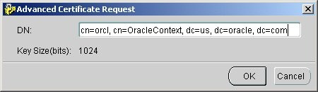Может случиться, что ПО Advanced Security доустанавливалось впоследствии. Из-за внутренних ошибок программа Net Manager не всегда в таких случаях способна показать позицию Oracle Advanced Security ниспадающего меню. Выйти из положения можно, подправив строку из файла netproperties в каталоге %ORACLE_HOME%\network\tools; например заменить: INSTALLEDCOMPONENTS=CLIENT,ORACLENET на: INSTALLEDCOMPONENTS=CLIENT,ORACLENET,ANO. (ANO - сокращение старого названия нынешнего ПО Advanced Security Option). Получение цифрового сертификатаДля установления защищенного соединения по SSL потребуется получить цифровые сертификаты подлинности: (а) «пользователя» и (б) «корневой». Сертификат пользователя будем получать на обращение к ресурсу, обозначенному следующим «различительным именем» (distinguished name, dn): cn=orcl, cn=OracleContext, dc=us, dc=oracle, dc=com (Предполагается, что имя экземпляра СУБД - orcl). Правила построения различительных имен многократно описаны в литературе и в интернете. Корневой сертификат понадобится для того, чтобы подтвердить сертификат пользователя. Подтвержденя ему не требуется, так как он подтверждает сам себя (отсюда название). Подготовка заявки на сертификат пользователяПолучение сертификата пользователя производится по подготовленной заявке (request). Подготовить заявку можно с помощью Wallet Manager, отдельно для бумажников на сервере и на клиенте. Обратиться к форме составления заявки можно через меню Operations ® Add Certificate Request. В форме Create Certificate Request следует выбрать Key Size = 1024 и нажать кнопку Advanced. В появившуюся форму нужно внести различительное имя и нажать OK: