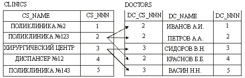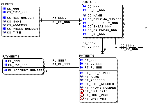 Таким образом, если таблица удовлетворяет НФБК, то она также удовлетворяет ЗНФ в смысле транзитивных зависимостей и 2НФ. Четвертая нормальная форма Таблица имеет четвертую нормальную форму (4НФ), если она имеет ЗНФ и не содержит многозначных зависимостей. Поскольку проблема многозначных зависимостей возникает в связи с многозначными атрибутами, то мы можем решить проблему, поместив каждый многозначный атрибут в свою собственную таблицу вместе с ключом, от которого атрибут зависит. Пятая нормальная форма. Пятая нормальная форма (5НФ) была предложена для того, чтобы исключить аномалии, связанные с особым типом ограничительных условий, называемых совместными зависимостями. Эти зависимости имеют в основном теоретический интерес и сомнительную практическую ценность. Следовательно, пятая нормальная форма в действительности не имеет практического применения. Нормальная форма область/ключ. Таблица имеет нормальную форму область/ключ (НФОК), если любое ограничительное условие в таблице является следствием определений областей и ключей. Однако не был дан общий метод приведения таблицы к НФОК. В качестве примера, рассмотрим структуру реляционной базы данных, описывающей "отношения" пациентов и докторов в произвольной клинике (область приложения примера выбрана из-за того, что в сертификационных тестах Oracle аналогичные примеры встречаются очень часто). Пусть существует некая клиника, основные характеристики которой описываются в таблице CLINICS, в данной клинике работают доктора, основные характеристики которых описывает таблица DOCTORS. Данные пациентов клиники хранятся в таблице PATIENTS. Взаимосвязи между таблицами представлены на рис.10. (Для упрощения предполагается, что у доктора может быть несколько пациентов, которые не являются пациентами других докторов, для реализации реальной картины, когда один пациент может относиться к нескольким разным докторам, между таблицами DOCTORS и PATIENTS необходимо включить дополнительную связывающую таблицу).