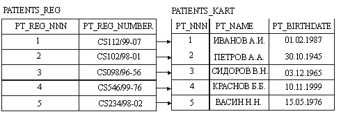 Представленная структура, конечно, не обладает функциональной полнотой с точки зрения проектирования АИС клиники, с ее помощью мы лишь рассмотрим различные типы отношений в реляционных СУБД. Перед тем, как перейти к рассмотрению вопросов стандартизации и целостности данных в РСУБД несколько рекомендаций по выбору наименований таблиц и полей. Внимательно взглянув на описание таблиц можно заметить, что генерация наименований таблиц и столбцов подчиняется некоторой синтаксической конструкции, которая в общем виде может быть представлена следующим образом: Для таблиц: <Псевдоним АИС>_<Псевдоним модуля АИС>_:_<Псевдоним подмодуля>_<Имя таблицы> Например, если бы мы разрабатывали АИС клиники c сокращенным названием CSL, то все таблицы входящие в данную систему было бы целесообразно называть CSL_<имя модуля>_<имя таблицы>. Для столбцов: <Псевдоним таблицы>_<имя столбца>. Например, как показано на рис.10. Регистрационный номер пациента храниться в поле PT_REG_NUMBER, таблицы PATIENTS, имеющий псевдоним PT. Конечно, использование этих не хитрых правил не является обязательным, но позволяет значительно облегчить читаемость разработанной информационной структуру. Предположите, как было бы все, если бы поля таблиц назывались P111, P112 и т.п., а ведь такие вещи встречаются практически очень часто, например в FoxPro 2.6. Перейдем к рассмотрению вопросов стандартизации и обеспечения ссылочной целостности реляционных таблиц. Преобразование отношений Поля таблиц могут находиться между собой в одном из следующих отношений: один-к-одному, один-ко-многим, многие-ко-многим и рекурсивных, определения которых приведены в табл.1. Рассмотрим преобразование отношений на примере АИС "ДОКТОР-ПАЦИЕНТ" (рис.10). Отношение один-к-одному представляет собой такое отношение, при котором каждой записи в таблице А соответствует единственная запись в таблице В (рис.11). Применение такого типа отношений встречается крайне редко и предназначено в основном для функционального разделения информации на несколько таблиц, т.е. когда не хотят, чтобы таблица БД "распухала" от второстепенной информации. На рис.10 представлено, как используя отношение один-к-одному таблица PATIENTS преобразована в две таблицы: PATIENTS_REG и PATIENTS_KART (на рисунке показаны только основные атрибуты таблиц). Также необходимо принимать во внимание, что БД использующие такие отношения не могут быть полностью нормализованы.