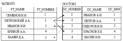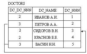 Рис.13. Отношение многие ко многим. Другим важным типом отношений - является рекурсивное отношение, т.е. такое отношение которое описывает связи между записями внутри одной таблицы БД, т.е. оно связывает объектное множество с ним самим. Пример рекурсивных отношений показан на рис.14., который иллюстрирует, что доктора Петров А.А. и Васин Н.Н. находятся в зависимости от доктора Сидорова В.Н.. В зависимости от функционального назначения этого отношения оно может иллюстрировать, например, что они являются пациентами доктора Сидорова В.Н., или Сидорова В.Н. является по отношению к ним начальником и т.п. Данный тип отношений позволят реализовать древовидную структуру функциональных отношений, например, структуру организации.