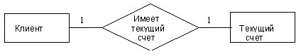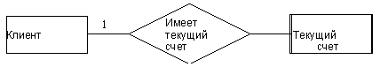 Рис.9. Отношение один ко многим. Это означает, что у клиента может быть несколько текущих счетов, но каждым текущим счетом по-прежнему пользуется только один клиент. Таким образом, в любом отношении один-ко-многим в. таблицу, описывающую объект, мощность со стороны которого равна "многим", включается столбец, являющийся внешним ключом, указывающим на другой объект. Отношение многие-ко-многим. Отношение ИМЕЕТ-ТЕКУЩИЙ-СЧЕТ имеет мощность многие-ко-многим.