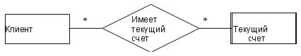 Рис.10. Отношение многие ко многим. Таким образом, мы предполагаем, что у клиента может быть несколько текущих счетов, и что каждым текущим счетом могут пользоваться несколько клиентов. Для того чтобы преобразовать отношение многие-ко-многим целесообразно создать таблицу пересечения, представляющую элементы двух других таблиц, находящихся в отношении многие-ко-многим. Рекурсивные отношения