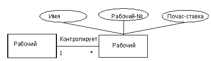 Рис.11. Рекурсивные отношения. Объектное множество WORKER(РАБОЧИЙ), дважды встречающееся на диаграмме, и это одно и то же объектное множество в обоих случаях. Обе копии объектного множества WORKER(РАБОЧИЙ) имеют одни и те же атрибуты. В этой модели два экземпляра объектного множества WORKER(РАБОЧИЙ) использованы для удобства, чтобы показать отношение SUPERVISES(КОНТРОЛИРУЕТ), существующее между объектами WORKER(РАБОЧИЙ) и WORKER(РАБОЧИЙ). Это отношение называется рекурсивным, поскольку оно связывает объектное множество с ним самим. В данном случае отношение мощности один-ко-многим означает, что одному работнику подчиняются несколько других работников. WORKER (WORKER-ID, NAME, HOURLY-RATE, WORKER-ID) Чтобы преобразовать объектное множество WORKER вместе с его атрибутами и отношением SUPERVISES в реляционную таблицу нужно изменить имя второго атрибута WORKER-ID на имя, соответствующее отношению SUPERVISES, которое оно представляет. SUPV-ID. WORKER (WORKER-ID, NAME, HOURLY-RАТЕ, SUPV-ID) Внешний ключ: SUPV-ID ссылается на WORKER SUPV-ID - это рекурсивный внешний ключ, поскольку он ссылается на WORKER-ID, то есть ключ своей собственной таблицы. Таким образом, в результате преобразования рекурсивных отношений появляются рекурсивные внешние ключи. Функциональные зависимости, определенные для реляционной модели, являются атрибутами отношения один-к-одному или один-ко-многим. Описанный процесс преобразования каждой из этих конструкций в атрибуты реляционных таблиц гарантирует, что они будут зависеть только от ключевых атрибутов. Таким образом, каждая полученная реляционная таблица будет иметь ЗНФ. Многозначные атрибуты реляционной модели встречаются только в отношениях многие-ко-многим. Поскольку они преобразуются в реляционные таблицы, обладающие составными ключами из ключевых атрибутов отдельных объектных множеств, то они гарантированно имеют 4НФ. 2.1.2. Понятие языка определения данных (ЯОД - DBTG)Язык - средство, при помощи которого определяется структура данных или схема, а также происходит запоминание данных и манипуляция ими. Язык, которым определяется схема, называется языком определения данных (ЯОД),а язык, используемый для запоминания данных и манипуляции ими, называется языком манипуляции данными (ЯМД). Процедура применения ЯОД и определения схемы такова: