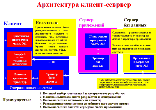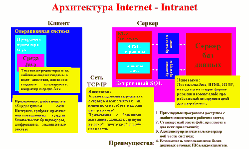 Рис.13. Сравнительные характеристики двух- и трехзвенной архитектуры клиент-сервер. В последнее время все большее развитие получает архитектура Интернет/Интранет. В основе реализации корпоративных информационных систем на базе данной архитектуры лежит принцип "открытой архитектуры", что во многом определяет независимость реализации корпоративной системы от конкретного производителя. Все программное обеспечение таких систем реализуется в виде аплетов или сервлетов (программ написанных на языке JAVA) или в виде cgi модулей (программ написанных как правило на Perl или С). Основными экономическими преимуществами данной архитектуры являются: