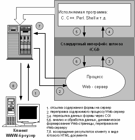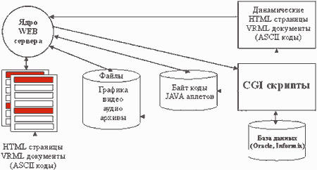 Рис.16. Функциональная схема интерактивного взаимодействия пользователей в архитектуре интернет/интранет. Перечисленные задачи WEB клиента обеспечиваются возможностями броузера и специализированным программным обеспечением (утилитами), размещенными на рабочей станции клиента. Следует отметить и тот факт, что жестких стандартов на построение WEB клиента пока нет и его компонентный состав может различаться. На сегодняшний день известны и широко применяются три основных технологии создания интерактивного взаимодействия с пользователем в Web. Первый путь заключается в использовании Стандартного Интерфейса Шлюза (Commom Gateway Interface) - CGI. Второй - включение JavaScript - сценариев в тело Web-страниц. И наконец самый мощный, предоставляющий практически неограниченные возможности способ - применение технологии Java (ипользование Java-аплетов). CGI - это механизм для выбора, обработки и форматирования информации. Возможность взаимодействия, обеспечиваемая CGI, предоставляется во многих формах, но в основном это динамический доступ к информации, содержащейся в базах данных. Например, многие узлы применяют CGI для того, чтобы пользователи могли запрашивать базы данных и получать ответы в виде динамически сформированных Web-страниц (рис.17). Имеются в виду узлы, предоставляющие доступ к базам данных, средствам поиска, и даже информационные системы, предающие сообщения в ответ на ввод пользователя. Все эти узлы используют CGI, чтобы принять ввод пользователя и передать его с сервера Web базе данных. База данных обрабатывает запрос и возвращает ответ серверу, который в свою очередь пересылает его опять броузеру для отображения. Без СGI база данных этого не смогла бы. Данный интерфейс можно считать посредником между броузером, сервером и любой информацией которая должна передаваться между ними. В отличии от HTML, CGI не является языком описания документов. Собственно, это и не язык вообще; это стандарт. Он просто определяет, как серверы Web передают информацию, используя приложения, исполняемые на сервере. Это способ расширения возможностей сервера Web без преобразования при этом его самого. Подобно тому как броузер Web обращается к вспомогательным приложениям для обработки информации, которую он не понимает, CGI предоставляет серверу Web возможность преложить работу на другие приложения, такие как базы данных и средства поиска.