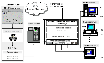Несомненно, между двумя сформулированными положениями существует тесная связь. В компилируемой среде трудно абстрагироваться от аппаратных особенностей компьютера, как трудно (хотя и можно) реализовать прозрачную динамическую загрузку по сети. С другой стороны, прием объектов извне требует повышенной осторожности при работе с ними, а, значит, и со всеми Java-программами. Принимать необходимые меры безопасности проще всего в интерпретируемой, а не компилируемой среде. Вообще, мобильность, динамизм и безопасность - спутники интерпретатора, а не компилятора. Принятые решения делают Java-среду идеальным средством разработки интерактивных клиентских компонентов (апплетов) Web-систем. Особо отметим прозрачную для пользователя динамическую загрузку объектов по сети. Из этого вытекает такое важнейшее достоинство, как нулевая стоимость администрирования клиентских систем, написанных на Java. Достаточно обновить версию объекта на сервере, после чего клиент автоматически получит именно ее, а не старый вариант. Без этого реальная работа с развитой сетевой инфраструктурой практически невозможна.