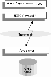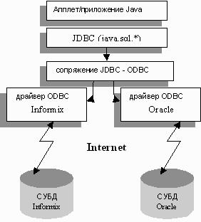 Рис.19 Варианты реализации связи JDBC с базой данных Сопряжение JDBC - ODBC В качестве составной части JDBC поставляется драйвер для доступа из JDBC к источникам данных ODBC (Open Database Connectivity), и называется "программа сопряжения JDBC - ODBC". Эта программа сопряжения реализована в виде JdbcOdbc.class и является библиотекой для доступа к драйверу ODBC. Поскольку JDBC конструктивно близок к ODBC, программа сопряжения является несложной надстройкой над JDBC. На внутреннем уровне этот драйвер отображает методы Java в вызовы ODBC и тем самым взаимодействует с любым ODBC - драйвером. Достоинство такой программы сопряжения состоит в том, что JDBC имеет доступ к любым базам данных, поскольку ODBC - драйверы распространены очень широко. В соответствии с правилами Internet JDBC идентифицирует базу данных при помощи URL, который имеет форму: jdbc:<субпротокол>:<имя, связанное с СУБД или Протоколом> У баз данных в Internet/intranet "имя" может содержать сетевой URL //<имя хоста>:<порт>/.. <субпротокол> может быть любым именем, которое понимает база данных. Имя субпротокола "odbc" зарезервированно для источников данных формата ODBC. Типичный JDBC URL для базы данных ODBC выглядит следующим образом: jdbc:odbc:<DNS - имя ODBC>;User=<имя пользователя>; PW=<пароль> Внутреннее устройство JDBC - приложения