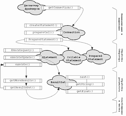 Рис.20. Иерархия классов JDBC и поток API JDBC Чтобы обработать информацию из базы данных, информационно-обучающая система на языке Java выполняет ряд шагов. На рис.20 показаны основные объекты JDBC, методы и последовательность выполнения, Во-первых, программа вызывает метод getConnection (), чтобы получить объект Connection.Затем она создает объект Statement и подготавливает оператор SQL. Оператор SQL может быть выполнен немедленно (объект Statement), а может быть откомпилирован (объект PreparedStatement) или представлен в виде вызова процедуры (объект CallableStatement). Когда выполняется метод executeQuery(), возвращается объект ResultSet. Операторы SQL, такие как updatе или delete не возвращают ResultSet. Для таких операторов используется метод executeUpdate(). Он возвращает целое, указывающее количество рядов, затронутых оператором SQL. ResultSet содержит ряды данных и анализируетcя методом next(). Если приложение обрабатывает транзакции, можно пользоваться методами rollback() и commit() для отмены или подтверждения изменений, внесенных оператором SQL. Примеры запроса и модификации базы данных с использованием JDBC Данный пример иллюстрирует как при помощи SQL - опрератора SELECT составляется список всех студентов из базы данных. Ниже приводятся шаги, которые необходимы для выполнения этого задания при помощи API JDBC. Каждый шаг имеет форму текста на языке Java с комментариями.