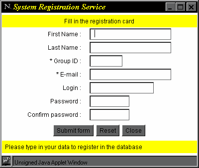 Рис.21. Интерфейс для регистрации пользователя в АИС. Таким образом, взаимодействие с базами данных из Java также отличается простотой и гибкостью, связанной с эффективной реализацией JDBC API. В сочетании со своей природной платформо-независимостью, Java предоставляет уникальный инструмент для создания интерактивных распределенных информационно-обучающих систем на база Internet/Intranet - технологий. Основными сложностями при реализации корпоративных систем на базе данной архитектуры являются: