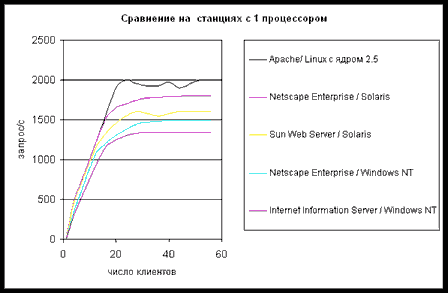 2.2.1. Сравнительные исследования типовых серверных платформ.Выбирая платформу для АИС, нужно учитывать множество аспектов. На решение влияют соображения, связанные с надежностью (кластеризация и балансировка нагрузки), среды разработки, работы над содержанием узла и защиты информации. Результаты тестирования различных платформ широко представлены в периодической печати, представим здесь лишь некоторые обобщения материалов тестирования []. При проведении испытаний оценивались Solaris 2.6, Windows NT Server 4 и Red Hat Linux 6.02 (ядро 2.2.11) при эксплуатации четырех web-серверов, занимающих ведущие позиции в мире: Microsoft Internet Information Server 4 (IIS), Netscape Enterprise Server 3.61, Web Server 2.1 корпорации Sun и Stronghold Web Server 2.4.1 (популярный вариант Web-сервера Apache с функциями защиты от несанкционированного доступа) (на тестах использовались триал версии указанного программного обеспечения). Все платформы были испытаны с помощью новой версии эталонного теста WebBench отделения Ziff-Davis Benchmark Operation.