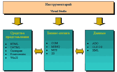 Рис.23. Функциональная схема информационной системы на базе Solaris Ключевой момент для понимания различий между платформами Linux, Microsoft и Sun - способ, которым серверные программы каждой из них обрабатывают большое число подключений. Обычно это делается в многопотоковом режиме. Многопотоковый режим возникает, когда прикладная программа (также называемая процессом) содержит множество небольших блоков исполняемого кода, работающих независимо друг от друга и, возможно, одновременно на разных процессорах. Эти потоки могут совместно пользоваться ресурсами и представляют собой способ организации программы, позволяющий одновременно выполнять несколько задач. Модель потоков Solaris весьма сложна. Она состоит из потоков на уровне ядра (kthreads) - реальных объектов, передаваемых отдельному процессору; потоков на пользовательском уровне и промежуточной структуры, называемой облегченным (lightweight) процессом. Это позволяет тонко управлять структурой прикладной программы и реализации в ней прикладной многозадачности. Stronghhold на платформе Solaris Создатели Web-сервера Stronghold (и Apache, основы Stronghold) считают, что многопотоковые программы обычно менее надежны, чем "монолитные". Такое различие стратегий объясняет значительные расхождения показателей производительности, поскольку и Sun Web Server 2.1, и Netscape Enterprise используют второй процессор, установленный в испытательных системах. Поэтому Stronghold, в зависимости от прикладного ПО, не столь эффективно использует оборудование Sun, содержащее до 64 процессоров. Netscape на платформе Solaris Netscape Enterprise Server 3.61 - Web-сервер, избранный для реализации большинства крупных узлов на основе Solaris, в том числе и корпорации Sun. Инструментальные средства фирмы Netscape, а также предлагаемые независимыми производителями, способствуют разработке сложных прикладных программ для Web с помощью сценариев на языках JavaScript, CORBA, Java. Еще одна важнейшая система, стоящая за добротными программами для Web на серверах Netscape, - сервер прикладных программ Netscape Application Server (NAS). Сервер NAS - среда программирования для объектов на языках C++ и Java - обеспечивает масштабируемость и устойчивость к сбоям прикладных программ. В NAS имеются инструменты для создания многоуровневых программ, объединяющих HTML и запросы к базам данных на серверах NAS. Sun Web Server Sun Web Server (SWS) обеспечивает разработку программ, конечно же, на языке Java. На SWS можно использовать сервлеты и разнообразные возможности, такие как CORBA. Сервлеты (servlet) - это Java-программы, запускаемые на сервере и, подобно CGI, передающие сверстанные HTML-страницы браузеру. Для сервлет существует собственный API к функциям рабочей среды сервера. В SWS также предусмотрена возможность использования серверных Java-страниц (Java Server Pages) - способа обращения к серверным функциям Java со страниц Web и из CGI-программ. При соответствующем использовании Web-серверов на платформе Solaris, эта операционная система на многопроцессорных станциях превосходит по производительности Windows NT. Такого результата достигла Sun Microsystems благодаря использованию Solaris Network Cache and Accelerator (SNCA) - мощного механизма кэширования для Web-сервера. SWS победил в испытаниях при обслуживании статических страниц. При выполнении динамических CGI-испытаний Netscape на платформе Solaris превзошел и SWS, и IIS для Windows NT. 2.2.1.3. Особенности функционирования АИС на платформе Microsoft.