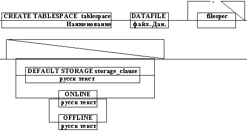 CREATE TABLESPASE Создает в базе данных область для хранения таблиц, сегментов и индексов, определяет файлы базы данных, параметры хранения по умолчанию и режим табличного пространства (автономный или оперативный).