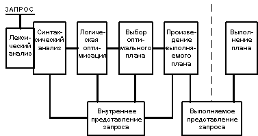 ![]() На первой фазе запрос, заданный на языке запросов, подвергается лексическому и синтаксическому анализу. При этом вырабатывается его внутреннее представление, отражающее структуру запроса и содержащее информацию, которая характеризует объекты базы данных, упомянутые в запросе (отношения, поля и константы). Информация о хранимых в базе данных объектах выбирается из каталогов базы данных. Внутреннее представление запроса используется и преобразуется на следующих стадиях обработки запроса. Форма внутреннего представления должна быть достаточно удобной для последующих оптимизационных преобразований. На второй фазе запрос во внутреннем представлении подвергается логической оптимизации. Могут применяться различные преобразования, "улучшающие" начальное представление запроса. Среди преобразований могут быть эквивалентные, после проведения которых получается внутреннее представление, семантически эквивалентное начальному (например, приведение запроса к некоторой канонической форме), Преобразования могут быть и семантическими: получаемое представление не является семантически эквивалентным начальному, но гарантируется, что результат выполнения преобразованного запроса совпадает с результатом запроса в начальной форме при соблюдении ограничений целостности, существующих в базе данных. После выполнения второй фазы обработки запроса его внутреннее представление остается непроцедурным, хотя и является в некотором смысле более эффективным, чем начальное. Третий этап обработки запроса состоит в выборе на основе информации, которой располагает оптимизатор, набора альтернативных процедурных планов выполнения данного запроса в соответствии с его внутреннем представлением, полученным на второй фазе. Для каждого плана оценивается предполагаемая стоимость выполнения запроса. При оценках используется статистическая информация о состоянии базы данных, доступная оптимизатору. Из полученных альтернативных планов выбирается наиболее дешевый, и его внутреннее представление теперь соответствует обрабатываемому запросу. На четвертом этапе по внутреннему представлению наиболее оптимального плана выполнения запроса формируется выполняемое представление плана. Выполняемое представление плана может быть программой в машинных кодах, если, как в случае System R, система ориентирована на компиляцию запросов в машинные коды, или быть машинно-независимым, но более удобным для интерпретации, если, как в случае INGRES, система ориентирована на интерпретацию запросов. В нашем случае это непринципиально, поскольку четвертая фаза обработки запроса уже не связана с оптимизацией. Наконец, на пятом этапе обработки запроса происходит его реальное выполнение. Это либо выполнение соответствующей подпрограммы, либо вызов интерпретатора с передачей ему для интерпретации выполняемого плана.