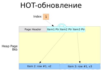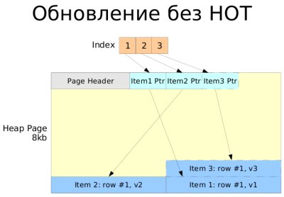 Суть HOT в следующем. Ранее, до реализации данного подхода, при обновлении строки в таблице каждая новая её версия приводила к появлению новых версий всех индексов, независимо от того, затрагивали ли данные изменения проиндексированные столбцы или нет (см. рис. «Обновление без HOT»). Теперь же, если новая версия строки попадает в ту же страницу памяти, что и предыдущая, и столбцы, по которым был создан индекс, не изменялись, индекс остаётся прежним. Но это ещё не всё. Если есть такая возможность, происходит «моментальное» повторное использование места в странице Heap. Что, естественно, сокращает объём работы, производимой при операции VACUUM. На рис. «HOT-обновление» схематически отображено, каким образом происходит теперь обновление строки.