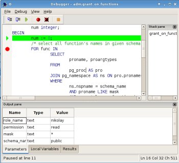 Компания EnterpriseDB (сотрудники которой являются активным разработчиками PostgreSQL, многие изменения версии 8.3 в области производительности являются именно их заслугой) выпустила отладчик pldebugger, который представляет собой contrib-модуль, позволяющий отлаживать PL/pgSQL-функции в стандартном инструменте для администрирования pgAdminIII и осуществлять профайлинг.