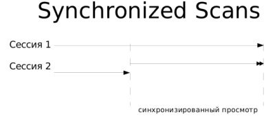 Ещё одно улучшение в области производительности относится к ситуациям, когда при выполнении запросов PostgreSQL последовательно просматривает таблицы (операция SeqScan). Если до версии 8.3 в таких случаях нередко возникали ситуации, когда разные процесса Постгреса одновременно делали одну и ту же работу — просматривали одну и ту же таблицу — то теперь, благодаря реализации Synchronized Scans («синронизованные просмотры»), в один и тот же момент времени для одной таблицы может проводиться не более одной операции просмотра. Достигается это следующим образом. Если в рамках какой-либо сессии требуется проведение SeqScan-а для некоторой таблицы, для которой уже выполняется SeqScan (для другой сессии), то произойдёт «прыжок на ходу» к результатам уже выполняющегося SeqScan-а. По завершении данного процесса, если это необходимо, будет осуществлён «добор» результатов с помощью ещё одного неполного SeqScan-а (см. рис).