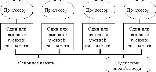 Каждый из этих параметров производительности воздействует на характеристики обмена. В частности, задержка и полоса пропускания могут меняться в зависимости от размера элемента данных. В общем случае, механизм, который одинаково хорошо работает как с небольшими, так и с большими объемами данных будет более гибким и эффективным. Таким образом, отличия разных машин с распределенной памятью определяются моделью памяти и механизмом обмена. Исторически машины с распределенной памятью первоначально были построены с использованием механизма передачи сообщений, поскольку это было очевидно проще и многие разработчики и исследователи не верили, что единое адресное пространство можно построить и в машинах с распределенной памятью. С недавнего времени модели обмена с общей памятью действительно начали поддерживаться практически в каждой разработанной машине (характерным примером могут служить системы с симметричной мультипроцессорной обработкой). Хотя машины с централизованной общей памятью, построенные на базе общей шины все еще доминируют в терминах размера компьютерного рынка, долговременные технические тенденции направлены на использование преимуществ распределенной памяти даже в машинах умеренного размера. Как мы увидим, возможно наиболее важным вопросом, который встает при создании машин с распределенной памятью, является вопрос о кэшировании и когерентности кэш-памяти. Многопроцессорные системы с общей памятьюТребования, предъявляемые современными процессорами к полосе пропускания памяти можно существенно сократить путем применения больших многоуровневых кэшей. Тогда, если эти требования снижаются, то несколько процессоров смогут разделять доступ к одной и той же памяти. Начиная с 1980 года эта идея, подкрепленная широким распространением микропроцессоров, стимулировала многих разработчиков на создание небольших мультипроцессоров, в которых несколько процессоров разделяют одну физическую память, соединенную с ними с помощью разделяемой шины. Из-за малого размера процессоров и заметного сокращения требуемой полосы пропускания шины, достигнутого за счет возможности реализации достаточно большой кэш-памяти, такие машины стали исключительно эффективными по стоимости. В первых разработках подобного рода машин удавалось разместить весь процессор и кэш на одной плате, которая затем вставлялась в заднюю панель, с помощью которой реализовывалась шинная архитектура. Современные конструкции позволяют разместить до четырех процессоров на одной плате. На рис. 3.28 показана схема именно такой машины. В такой машине кэши могут содержать как разделяемые, так и частные данные. Частные данные - это данные, которые используются одним процессором, в то время как разделяемые данные используются многими процессорами, по существу обеспечивая обмен между ними. Когда кэшируется элемент частных данных, их значение переносится в кэш для сокращения среднего времени доступа, а также требуемой полосы пропускания. Поскольку никакой другой процессор не использует эти данные, этот процесс идентичен процессу для однопроцессорной машины с кэш-памятью. Если кэшируются разделяемые данные, то разделяемое значение реплицируется и может содержаться в нескольких кэшах. Кроме сокращения задержки доступа и требуемой полосы проп