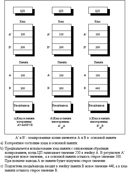 Эти две схемы во многом похожи на схемы работы кэш-памяти со сквозной записью и с записью с обратным копированием. Также как и схема задержанной записи с обратным копированием требует меньшей полосы пропускания памяти, так как она использует преимущества операций над целым блоком, протокол записи с аннулированием обычно требует менее тяжелого трафика, чем протокол записи с обновлением, поскольку несколько записей в один и тот же блок кэш-памяти не требуют трансляции каждой записи. При сквозной записи память обновляется почти мгновенно после записи (возможно с некоторой задержкой в буфере записи). Подобным образом при использовании протокола записи с обновлением другие копии обновляются так быстро, насколько это возможно. Наиболее важное отличие в производительности протоколов записи с аннулированием и с обновлением связано с характеристиками прикладных программ и с выбором размера блока. Основы реализации Ключевым моментом реализации в многопроцессорных системах с небольшим числом процессоров как схемы записи с аннулированием, так и схемы записи с обновлением данных, является использование для выполнения этих операций механизма шины. Для выполнения операции обновления или аннулирования процессор просто захватывает шину и транслирует по ней адрес, по которому должно производиться обновление или аннулирование данных. Все процессоры непрерывно наблюдают за шиной, контролируя появляющиеся на ней адреса. Процессоры проверяют не находится ли в их кэш-памяти адрес, появившийся на шине. Если это так, то соответствующие данные в кэше либо аннулируются, либо обновляются в зависимости от используемого протокола. Последовательный порядок обращений, присущий шине, обеспечивает также строго последовательное выполнение операций записи, поскольку когда два процессора конкурируют за выполнение записи в одну и ту же ячейку, один из них должен получить доступ к шине раньше другого. Один процессор, получив доступ к шине, вызовет необходимость обновления или аннулирования копий в других процессорах. В любом случае, все записи будут выполняться строго последовательно. Один из выводов, который следует сделать из анализа этой схемы заключается в том, что запись в разделяемый элемент данных не может закончиться до тех пор, пока она не захватит доступ к шине. В дополнение к аннулированию или обновлению соответствующих копий блока кэш-памяти, в который производилась запись, мы должны также разместить элемент данных, если при записи происходит промах кэш-памяти. В кэш-памяти со сквозной записью последнее значение элемента данных найти легко, поскольку все записываемые данные всегда посылаются также и в память, из которой последнее записанное значение элемента данных может быть выбрано (наличие буферов записи может привести к некоторому усложнению). Однако для кэш-памяти с обратным копированием задача нахождения последнего значения элемента данных сложнее, поскольку это значение скорее всего находится в кэше, а не в памяти. В этом случае используется та же самая схема наблюдения, что и при записи: каждый процессор наблюдает и контролирует адреса, помещаемые на шину. Если процессор обнаруживает, что он имеет модифицированную ("грязную") копию блока кэш-памяти, то именно он должен обеспечить пересылку этого блока в ответ на запр