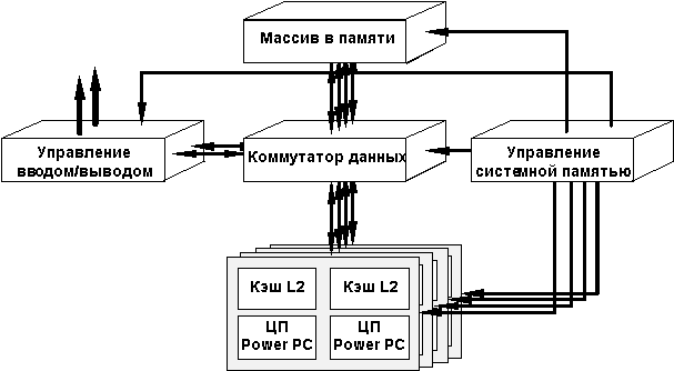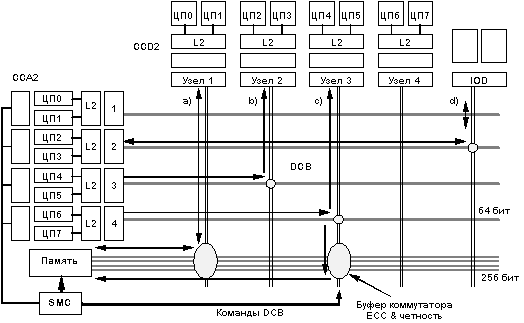 Режим обращения к памяти - Memory mode: (a) Процессорный узел или узел в/в коммутируется с массивом памяти (MA). Такое соединение используется для организации операций чтения памяти или записи в память. Режим вмешательства (чтение): (b) Читающий узел коммутируется с другим узлом (вмешивающимся узлом) и шиной данных MA. Этот режим используется тогда, когда при выполнении операции чтения строки от механизма наблюдения за когерентным состоянием памяти поступает ответ, что данная строка находится в кэш-памяти другого узла и модифицирована. В этом случае данные, извлекаемые из строки кэша владельца, подаются читающему узлу и одновременно записываются в MA. Если читающий и вмешивающийся ЦП находятся внутри одного и того же узла, то данные заворачиваются назад на уровне узла и одновременно записываются в память. Режим вмешательства (чтение с намерением модификации - RWITM):(c) Процессорный узел или узел в/в (читающий узел) коммутируется с другим процессорным узлом или узлом в/в. Этот режим используется тогда, когда при выполнении операция RWITM от механизма наблюдения поступает ответ, что данная строка находится в кэш-памяти другого узла и модифицирована. В этом случае данные, извлекаемые из строки кэша владельца, подаются только читающему узлу и не записываются в память. Режим программируемого ввода/вывода (PIO): (d) Процессорный узел коммутируется с узлом в/в. Это случай операций PIO, при котором данные обмениваются только между процессором и узлом в/в. Режим в/в с отображением в памяти (memory mapped): Главный узел коммутируется с узлами в/в (подчиненными узлами), вовлеченными в транзакцию. Это случай операций с памятью. Параметры производительности Вслед за установочной фазой транзакции (например, после установки адреса на адресной шине) данные могут пересылаться через коммутатор на полной скорости синхронизации. Это возможно благодаря организации соединению точка-точка, которое создается для каждой отдельной транзакции. Поэтому в дальнейшем какие-либо помехи отсутствуют. Возможно также выполнять параллельно несколько операций, например, множественный доступ к памяти или пересылки между кэшами. Для того чтобы уменьшить задержку памяти, операции чтения начинаются до выполнения каких-либо действий по обеспечению глобальной когерентности на уровне системы. Ответы когерентности полностью синхронизированы, разрешаются за фиксированное время и поступают всегда прежде, чем будет захвачен разделяемый ресурс - шина памяти. Это помогает избежать ненужных захватов шины. Любые транзакции, которые не разрешаются когерентно за данное фиксированное время, позднее будут повторены системой. Используемая в системе внутренняя частота синхронизации равна 75 МГц, что позволяет оценить уровень производительности разработанной архитектуры. Интерфейс физической памяти имеет ширину 32 байта и, учитывая арбитраж шины, позволяет пересылать 32 байта каждые 3 такта синхронизации. Это дает скорость передачи данных 800 Мбайт/с, поддерживаемую на уровне интерфейса памяти. Каждый порт ЦП имеет ширину 8 байт и способен передавать по 8 байт за такт, т.е. со скоростью 600 Мбайт/с. Следует отметить, что это скорость, достигаемая как при пересылке ЦП-память, так и при пересылке кэш-кэш. Скорость 800 Мбайт/с для памяти поддерживается с помощью буферов в коммутаторе, которые позволяют конве