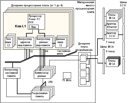 ![]() Рис. 4.5. Физическая реализация PowerScale Платы памяти: Каждая плата памяти состоит из четного числа банков. Максимальное число банков равно 16. Объем памяти на каждой плате может быть 64, 256 или 512 Мбайт. Коммутатор данных (DCB) интегрирован в нескольких СБИС (4х16 бит) и функционально соединяет магистраль данных MPB_SysBus с подсистемой памяти, модулями ЦП и платой в/в. Ширина магистрали данных DCB на уровне массива памяти составляет 256 + 32 бит, а ширина магистрали данных для каждого порта ЦП и порта в/в равна 64 + 8 бит. Операции DCB управляются контроллером системной памяти (SMC) с помощью командной шины, обеспечивающей необходимую коммутацию устройств. Семейство UNIX-серверов EscalaНа российский рынок в настоящее время активно продвигаются UNIX-серверы семейства Escala - многопроцессорные системы с архитектурой PowerScale, построенные на базе микропроцессора PowerPC 601. Они предлагаются для работы в качестве нескольких типов серверов приложений: сервера транзакций (Transation Server) при использовании мониторов обработки транзакций подобных Tuxedo, сервера базы данных (Database Server) на основе таких известных систем как Oracle или Informix, а также управляющего сервера (System Management Server), обеспечивающего управление инфраструктурой предприятия и существенно упрощающего администрирование гетерогенными системами и сетями. Серверы Escala двоично совместимы с системами Bull DPX/20, а их архитектура разработана с учетом возможности применения новейших процессоров PowerPC 604 и 620. Основные характеристики серверов Escala в зависимости от применяемого конструктива даны в таблице 4.1. Системы семейства Escala обеспечивают подключение следующих коммуникационных адаптеров: 8-, 16- и 128-входовых адаптеров асинхронных последовательных портов, 1- или 4-входовых адаптеров портов 2 Мбит/с X.25, а также адаптеров Token-Ring, Ethernet и FDDI. Таблица 4.1