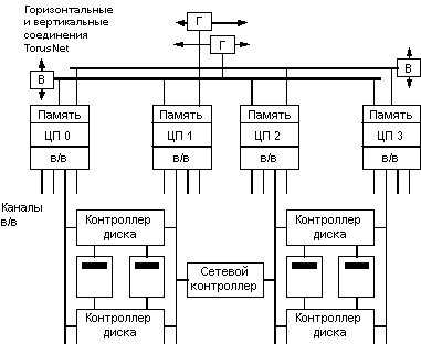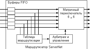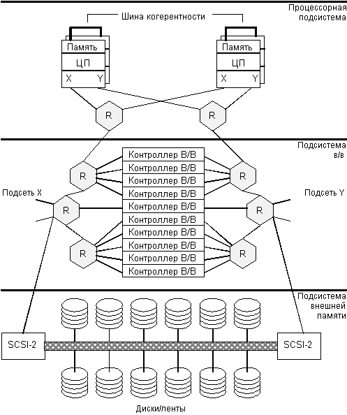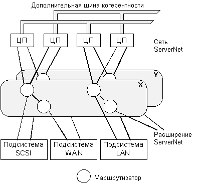 ![]() Рис. 4.8. Архитектура системы на базе ServerNet. На рис. 4.8 показана архитектура типичной системы, построенной на базе ServerNet. Эта система состоит из нескольких процессорных узлов и узлов ввода/вывода, объединенных друг с другом системной сетью ServerNet. Базовым элементом системной сети ServerNet является маршрутизатор, выполненный в виде отдельной заказной СБИС. Для обеспечения отказоустойчивости предполагается возможность построения двух независимых подсетей ServerNet: X и Y. В типовой конфигурации системы большинство ее узлов имеют двухпортовые интерфейсы, обеспечивающие подсоединение каждого узла к этим независимым подсетям. Одной из дополнительных возможностей новой архитектуры является наличие специальной шины когерентности, допускающей подключение до четырех ЦП. Эта шина обеспечивает согласованное состояние общей для нескольких процессорных узлов памяти и их кэшей при выполнении программ, разработанных в расчете на мультипроцессорную обработку в системе с разделяемой общей памятью. При работе под управлением операционных систем, поддерживающих отказоустойчивость программными средствами (подобных NonStop Kernel), процессорные узлы выполняют независимые потоки команд. В отличие от более ранних систем, которые для передачи сообщений между процессорами и реализации операций ввода/вывода использовали разные интерфейсы, в новой архитектуре все пересылки данных осуществляются ЦП по сети ServerNet. При использовании операционных систем, в которых отсутствуют специальные средства поддержки отказоустойчивости, последнее свойство может быть реализовано с помощью аппаратных средств путем создания конфигураций ЦП в виде дуплексных пар. В этом случае пары узлов ЦП выполняют идентичные потоки команд. Если один ЦП из пары отказывает, другой продолжает работать. Таким процессорам в сети ServerNet присваивается общий идентификатор узла, и все пакеты, адресуемые с помощью этого идентификатора, дублируются и доставляются одновременно двум ЦП. При отсутствии неисправностей оба ЦП в паре создают идентичные исходящие пакеты. Поэтому в случае нормальной работы логика маршрутизации ServerNet может выбрать для пересылки пакеты любого узла. При этом для обнаружения неисправностей используются возможности самой сети ServerNet. Как уже отмечалось, для обеспечения отказоустойчивости в системе Integrity требуются три процессорных кристалла и три массива микросхем памяти. Новая архитектура требует четырех процессорных кристаллов (два на модуль ЦП) и двух массивов микросхем памяти. Стоимость реализации этих двух подходов существенно зависит от размера памяти. Для типовых систем оба метода имеют сравнимую стоимость. ServerNetServerNet представляет собой быструю, масштабируемую, надежную системную сеть, обеспечивающую гибкость соединения большого числа ЦП и периферийных устройств в/в между собой. Главными свойствами этой сети коммутации пакетов являются малая задержка и высокая надежность передачи данных. Для уменьшения задержки в сети применяется метод червячной маршрутизации, не требующий приема всего пакета до его отсылки к следующему приемнику. Физический уровень ServerNet образуют независимые каналы приема и передачи, каждый из которых имеет 9-битовое поле команд/данных и сигнал синхронизации. Поле команд/данных обеспечивает кодирование 256 символов данных и до 2