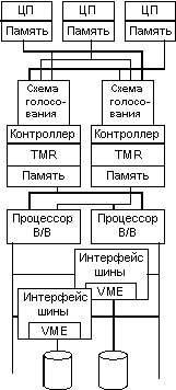 ![]() Рис. 4.6. Архитектура NonStop После разработки и успешных испытаний системы Cyclone компания Tandem перешла на применение в своих изделиях RISC процессоров компании MIPS (вместо использовавшихся ранее заказных CISC процессоров). В системах CLX/R и К200 используются процессоры R3000, а в системах Himalaya K10000, K20000 и K2000 - процессоры R4400. Одновременно с объявлением в 1993 году о начале поставок нового семейства систем Himalaya компания анонсировала также оптоволоконную сеть межпроцессорного обмена TorusNet, предназначенную для построения крупномасштабных кластеров. TorusNet обеспечивает соединение четырехпроцессорных секций с помощью избыточной сети с топологией двухмерного тора. Все аппаратные компоненты систем NonStop построены на основе принципа "быстрого проявления неисправности" (fail fast disign), в соответствии с которым каждый компонент должен либо функционировать правильно, либо немедленно останавливаться. В более ранних системах Tandem реализация этого принципа широко опиралась на использование методов проверки четности, избыточного кодирования или проверки допустимости состояния при выполнении каждой логической функции. Современные конструкции для обнаружения ошибок в сложной логике полагаются главным образом на методы дублирования и сравнения. Все системы, имеющие ЦП на базе микропроцессоров, для гарантии целостности данных и быстрого обнаружения неисправностей выполняют сравнение выходов дублированных и взаимно синхронизированных микропроцессоров. В системах NonStop ответственность за восстановление после обнаружения неисправности в аппаратуре возлагается на программное обеспечение. Операционная система NonStop Kernel систем NonStop непрерывно развивалась и к настоящему времени превратилась из патентованной фирменной операционной системы в систему, которая обеспечивает полностью открытые интерфейсы, построенные на основе промышленных стандартов. Для поддержки устойчивости критически важных процессов в NonStop Kernel реализованы низкоуровневые механизмы контрольных точек, а также специальный слой программных средств, на котором строится как патентованная среда Guardian, так и открытая среда Posix-XPG/4. NonStop Kernel базируется на механизмах передачи сообщений и обеспечивает средства прозрачного масштабирования системы в пределах 16-процессорного узла, 224-процессорного домена или 4080-процессорной (локальной или глобальной) сети TorusNet. Архитектура систем IntegrityОсновной задачей компании Tandem при разработке систем семейства Integrity было обеспечение устойчивости к одиночным отказам аппаратуры при соблюдении 100% переносимости стандартных UNIX-приложений. Для маскирования аппаратных неисправностей в системах Integrity используется тройное модульное резервирование (TMR - triple-modular redundancy) в процессоре, кэш-памяти и основной памяти (см. рис. 4.7).