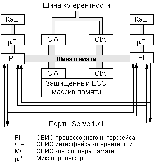 ![]() Рис. 4.9. СБИС 6-портового маршрутизатора ServerNet. Процессорный модульОдним из базовых элементов системы является процессорный модуль (ЦП), блок-схема которого показана на рис. 4.10. В ЦП, построенном на принципах быстрого проявления неисправностей, имеются два порта ServerNet, обеспечивающие его соединение через системную сеть с другими ЦП и устройствами в/в. Для реализации механизмов разделяемой общей памяти несколько ЦП могут объединяться друг с другом с помощью шины когерентности.