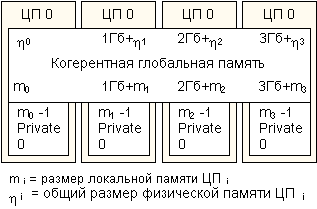 ![]() Рис. 4.11. Распределение памяти в четырехпроцессорной SMP-системе С целью повышения производительности в каждом ЦП поддерживается свое собственное (локальное) пространство памяти. В каждом процессоре его локальная память начинается с физического адреса 0, ее размер задается в процессе установки конфигурации системы. К локальной памяти может обращаться только локальный процессор. В такой архитектуре можно выделить три отдельных класса памяти (рис. 4.11). Наименьшее время доступа имеет локальная память, доступ к глобальной памяти, размещенной на плате локального процессора, занимает больше времени, а доступ к глобальной памяти на плате другого ЦП занимает еще больше времени. Локальная память каждого ЦП содержит копию части программного кода и данных операционной системы, доступ к которым разрешен только по чтению. Кроме того, в локальную память операционная система может поместить некоторые частные для процессора данные. Проведенная оценка показала, что размещение этих объектов в локальной памяти и случайное распределение глобальной памяти будет обеспечивать производительность, сравнимую с производительностью системы, реализующей механизмы единой глобальной памяти. Системы с разделяемой памятью могут функционировать либо в симплексном, либо в дуплексном режиме. Система, построенная на узлах SMP и обеспечивающая отказоустойчивость программными средствами, может использовать симплексный режим. Полностью аппаратная отказоустойчивая система с масштабируемостью SMP требует реализации дуплексного режима работы. Шина когерентности может также поддерживать работу гибридных распределенных систем, в которых распределенная память используется для обмена данными между процессорами. В этом случае система распределяет большую часть памяти под "локальные нужды" процессоров, а в глобальную память помещает только разделяемые данные. Система обслуживанияОсновные функции системы обслуживания включают инсталляцию системы, формирование сообщений об ошибках, диагностику и управление средствами контроля питающих напряжений и температурных режимов работы. Системой обслуживания управляют два сервисных процессора (SP), которые размещаются в каждой стойке и работают как специализированные контроллеры в/в ServerNet. SP, размещенные в разных стойках, также связаны друг с другом посредством ServerNet. Система обслуживания использует специальную систему независимых шин. Эти шины базируются на двух стандартных для промышленности интерфейсах: SPI (Serial Peripheral Interconnect) компании Motorola и систему сканирования в стандарте IEEE 1149.1 JTAG. SPI используется в качестве недорогой последовательной шины в/в для связи со всеми средствами контроля и управления состоянием окружающей среды. Система обслуживания использует средства сканирования для управления, инициализации, тестирования и отображения работы всех СБИС. Применяемое Tandem расширение к стандарту IEEE 1149.1, обеспечивает доступ к регистрам СБИС. Работа средств сканирования никак не затрагивает нормальную работу СБИС. Этот универсальный механизм обеспечивает средство для инициализации СБИС, определения топологии ServerNet и передачи сообщений об ошибках. ИнициализацияСервисные процессоры несут полную ответственность за инициализацию системы. Во время начальной установки системы они прежде всего создаю