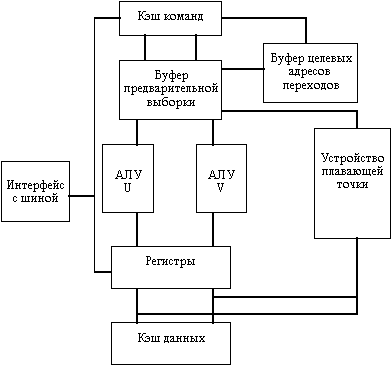 Блок-схема процессора Pentium представлена на рисунке 5.1. Прежде всего новая микроархитектура этого процессора базируется на идее суперскалярной обработки (правда с некоторыми ограничениями). Основные команды распределяются по двум независимым исполнительным устройствам (конвейерам U и V). Конвейер U может выполнять любые команды семейства x86, включая целочисленные команды и команды с плавающей точкой. Конвейер V предназначен для выполнения простых целочисленных команд и некоторых команд с плавающей точкой. Команды могут направляться в каждое из этих устройств одновременно, причем при выдаче устройством управления в одном такте пары команд более сложная команда поступает в конвейер U, а менее сложная - в конвейер V. Такая попарная выдача команд возможна правда только для ограниченного подмножества целочисленных команд. Команды арифметики с плавающей точкой не могут запускаться в паре с целочисленными командами. Одновременная выдача двух команд возможна только при отсутствии зависимостей по регистрам. При остановке команды по любой причине в одном конвейере, как правило останавливается и второй конвейер. Остальные устройства процессора предназначены для снабжения конвейеров необходимыми командами и данными. В отличие от процессоров i486 в процессоре Pentium используется раздельная кэш-память команд и данных емкостью по 8 Кбайт, что обеспечивает независимость обращений. За один такт из каждой кэш-памяти могут считываться два слова. При этом кэш-память данных построена на принципах двухкратного расслоения, что обеспечивает одновременное считывание двух слов, принадлежащих одной строке кэш-памяти. Кэш-память команд хранит сразу три копии тегов, что позволяет в одном такте считывать два командных слова, принадлежащих либо одной строке, либо смежным строкам для обеспечения попарной выдачи команд, при этом третья копия тегов используется для организации протокола наблюдения за когерентностью состояния кэш-памяти. Для повышения эффективности перезагрузки кэш-памяти в процессоре применяется 64-битовая внешняя шина данных. В процессоре предусмотрен механизм динамического прогнозирования направления переходов. С этой целью на кристалле размещена небольшая кэш-память, которая называется буфером целевых адресов переходов (BTB), и две независимые пары буферов предварительной выборки команд (по два 32-битовых буфера на каждый конвейер). Буфер целевых адресов переходов хранит адреса команд, которые находятся в буферах предварительной выборки. Работа буферов предварительной выборки организована таким образом, что в каждый момент времени осуществляется выборка команд только в один из буферов соответствующей пары. При обнаружении в потоке команд операции перехода вычисленный адрес перехода сравнивается с адресами, хранящимися в буфере BTB. В случае совпадения предсказывается, что переход будет выполнен, и разрешается работа другого буфера предварительной выборки, который начинает выдавать команды для выполнения в соответствующий конвейер. При несовпадении считается, что переход выполняться не будет и буфер предварительной выборки не переключается, продолжая обычный порядок выдачи команд. Это позволяет избежать простоев конвейеров при правильном прогнозе направления перехода. Окончательное решение о направлении перех