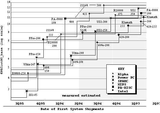 ![]() Рис. 5.1. Упрощенная блок схема процессора Pentium Следует отметить, что возросшая производительность процессора Pentium требует и соответствующей организации системы на его основе. Компания Intel разработала и поставляет все необходимые для этого наборы микросхем. Прежде всего для согласования скорости с динамической основной памятью необходима кэш-память второго уровня. Контроллер кэш-памяти 82496 и микросхемы статической памяти 82491 обеспечивают построение такой кэш-памяти объемом 256 Кбайт и работу процессора без тактов ожидания. Для эффективной организации систем Intel разработала стандарт на высокопроизводительную локальную шину PCI. Выпускаются наборы микросхем для построения мощных компьютеров на ее основе. В настоящее время компания Intel разработала и выпустила новый процессор, продолжающий архитектурную линию x86. Этот процессор получил название P6 или PentiumPro. Он работает с тактовыми частотами 150: 166: 180 и 200 МГц. PentiumPro обеспечивает полную совместимость с процессорами предыдущих поколений. Он предназначен главным образом для поддержки высокопроизводительных 32-битовых вычислений в области САПР, трехмерной графики и мультимедиа: а также широкого круга коммерческих приложений баз данных. По результатам испытаний на тестах SPEC (8.58 SPECint95 и 6.48 SPECfp95) процессор PentiumPro по производительности целочисленных операций в текущий момент времени вышел на третье место в мировой классификации, уступая только 180 МГц HP PA-8000 и 400 МГц DEC Alpha (см. рис. 5.2). Для достижения такой производительности необходимо использование технических решений, широко применяющихся при построении RISC-процессоров: