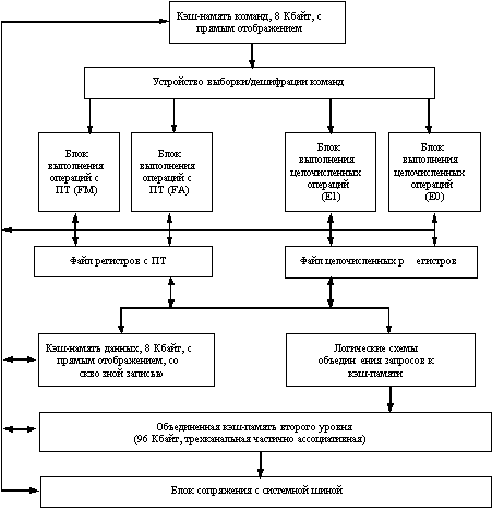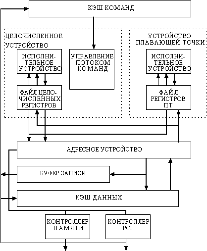Особенности архитектуры Alpha компании DECВ настоящее время семейство микропроцессоров с архитектурой Alpha представлено несколькими кристаллами, имеющими различные диапазоны производительности, работающие с разной тактовой частотой и рассеивающие разную мощность. Первым на рынке появился 64-разрядный микропроцессор Alpha (DECchip 21064) . Он представляет собой RISC-процессор в однокристальном исполнении, в состав которого входят устройства целочисленной и плавающей арифметики, а также кэш-память емкостью 16 Кб. Кристалл проектировался с учетом реализации передовых методов увеличения производительности, включая конвейерную организацию всех функциональных устройств, одновременную выдачу нескольких команд для выполнения, а также средства организации симметричной многопроцессорной обработки. В кристалле имеются два регистровых файла по 32 64-битовых регистра: один для целых чисел, второй - для чисел с плавающей точкой. Для обеспечения совместимости с архитектурами MIPS и VAX архитектура Alpha поддерживает арифметику с одинарной и двойной точностью как в соответствии со стандартом IEEE 754, так и в соответствии с внутренним для компании стандартом арифметики VAX. Самая мощная модель процессора 21064 работает на частоте 200 МГц. В конце 1993 года появилась модернизированная версия кристалла - модель 21064А, имеющая на кристалле кэш-память удвоенного объема и работающая с тактовой частотой 275 МГц. Затем были выпущены модели 21066 и 21068, оперирующие на частоте 166 и 66 МГц. Отличительной особенностью этой ветви процессоров Alpha является реализация на кристалле шины PCI. Это существенно упрощает и удешевляет как проектирование, так и производство компьютеров. Отличительная особенность модели 21068 - низкая потребляемая мощность (около 8 ватт). Основное предназначение этих двух новых моделей - персональные компьютеры и одноплатные ЭВМ. На рисунке 5.17 представлена блок-схема микропроцессора 21066. Основными компонентами этого процессора являются: кэш-память команд, целочисленное устройство, устройство плавающей точки, устройство выполнения команд загрузки/записи, кэш-память данных, а также контроллер памяти и контроллер ввода/вывода.
