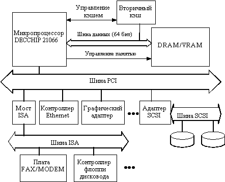 ![]() Рис. 5.18. Пример построения системы на базе микропроцессора Alpha 21066 Высокоскоростная шина PCI имеет ряд привлекательных свойств. Помимо возможности работы с прямым доступом к памяти и программируемым вводом/выводом она допускает специальные конфигурационные циклы, расширяемость до 64 бит, компоненты, работающие с питающими напряжениями 3.3 и 5 В, а также более быстрое тактирование. Базовая реализация шины PCI поддерживает мультиплексирование адреса и данных и работает на частоте 33 МГц, обеспечивая максимальную скорость передачи данных 132 Мбайт/с. Шина PCI непосредственно управляется микропроцессором. На рисунке 5.18 показаны некоторые высокоскоростные периферийные устройства: графические адаптеры, контроллеры SCSI и сетевые адаптеры, подключенные непосредственно к шине PCI. Мостовая микросхема интерфейса ISA позволяет подключить к системе низкоскоростные устройства типа модема, флоппи-дисковода и т.д. В настоящее время выпущена модернизированная версия этого микропроцессора. Как и его предшественник, новый кристалл Alpha 21066A помимо интерфейса PCI содержит на кристалле интегрированный контроллер памяти и графический акселератор. Эти характеристики позволяют значительно снизить стоимость реализации систем, базирующихся на Alpha 21066A, и обеспечивают простой и дешевый доступ к внешней памяти и периферийным устройствам. Alpha 21066A имеет две модификации в соответствии с частотой: 100 МГц и 233 МГц. Модель с 233 МГц обеспечивает производительность 94 и 100 единиц, соответственно, по тестам SPECint92 и SPECfp92. Новейший микропроцессор Alpha 21164 представляет собой вторую полностью новую реализацию архитектуры Alpha. Микропроцессор 21164, представленный в сентябре 1994 года, обеспечивает производительность 330 и 500 единиц, соответственно, по шкалам SPECint92 и SPECfp92 или около 1200 MIPS и выполняет до четырех инструкций за такт. На кристалле микропроцессора 21164 размещено около 9,3 миллиона транзисторов, большинство из которых образуют кэш. Кристалл построен на базе 0.5 микронной КМОП технологии компании DEC. Он собирается в 499-контактные корпуса PGA (при этом 205 контактов отводятся под разводку питания и земли) и рассеивает 50 Вт при питающем напряжении 3.3 В на частоте 300 МГц. Переход в 1996 году на 0.35 микронную КМОП технологию привел к возможности дальнейшего увеличения тактовой частоты и производительности процессора. В настоящее время процессоры 21164 выпускаются с тактовой частотой 366 МГц (11.3 SPECint95, 15.4 SPECfp95) и 433 МГц (13.3 SPECint95, 18.3 SPECfp95). В конце 1996 года начнутся массовые поставки 21164 с тактовой частотой 500 МГц (15.4 SPECint95, 21.1 SPECfp95). Таким образом, компания DEC в настоящее время имеет самые мощные процессоры, пиковая производительность которых составляет 2 миллиарда операций в секунду. Ключевыми моментами для реализации высокой производительности является суперскалярный режим работы процессора, обеспечивающий выдачу для выполнения до четырех команд в каждом такте, высокопроизводительная неблокируемая подсистема памяти с быстродействующей кэш-памятью первого уровня, большая, размещенная на кристалле, кэш-память второго уровня и уменьшенная задержка выполнения операций во всех функциональных устройствах. На рисунке 5.19 представлена блок-схема процессора, который включает пять функциональных устройств: устройство управления потоком команд (IBOX), целочисленное устройство (EBOX), устройство пла