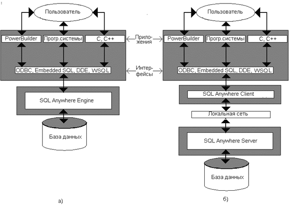 Рис. 1. Взаимодействие приложений-клиентов с базой данных в различных вариантах СУБД SYBASE SQL Anywhere: Компоненты SQL Anywhere server/client и SQL Anywhere engine составляют основу СУБД. Однако наряду с ними в состав СУБД входит и ряд других компонентов. Все вместе эти компоненты составляют комплект поставки SQL Anywhere, в который входят: