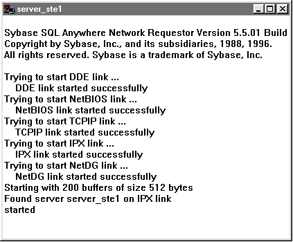 Как и для удаленного сервера, для удаленного клиента желательно указывать используемые сетевые протоколы. Для некоторых приложений в непосредственном запуске компоненты SQL Anywhere client нет необходимости. К числу таких приложений относятся SQL Central и ISQL и ряд других приложений. Данное обстоятельство объясняется тем, что эти приложения сами запускают компоненту SQL Anywhere client. При инициализации клиентской компоненты на экране монитора появляется ее окно. Чтобы увидеть содержимое этого окна следует запустить клиентскую компоненту. Для воспользуемся командной строкой. В ней следует ввести следующую команду: c:\SQLany50\WIN23\Dbclient.exe Server_ste1. Содержимое окна клиентской компоненты очень похоже на содержимое окна удаленного сервера в начальный момент его работы. Его вид представлен ниже на рис. 5.