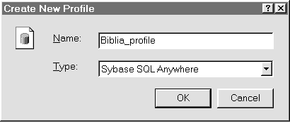 Рис. 12. Окно Create New Profile После того как вы введете название профайла Biblia_profile и щелкните мышью по кнопке OK. Тогда на экране появится полное окно параметров соединения SQL Anywhere Logon (см. рис. 8). Заполним его теми же данными и щелкнем по кнопке OK. Вследствие проведенных действий список, профайлов пополнится еще одним элементом - Biblia_profile (рис. 13).