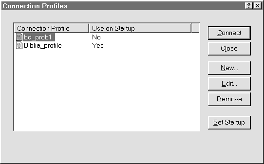 Рис. 13. Окно Сonnection Profiles с вновь созданным профайлом Для того, чтобы воспользоваться одним из профайлов для установления соединения, необходимо выделить мышью требуемый профайл. Далее следует щелкнуть мышкой по кнопке Connect.. Тогда в случае правильно установленных значений параметров соединения произойдет подключение к базе данных (см. рис. 10). С помощью кнопок Edit или Remove вы можете отредактировать или удалить любой профайл. Кнопка Set Startup предоставляет вам возможность автоматического подключения базы данных при помощи профайла при запуске SQL Central. Для этого следует установить признак Use on Startup в состояние Yes. , что и сделано для профайла Biblia_profile. Задание значений для данного признака (Yes/No) осуществляется кнопкой Set Startup. Таким образом, в результате создания профайла Biblia_profile при очередном использовании SQL Central автоматически будет подключена база данных Biblia (см. рис. 10). ПРИМЕЧАНИЕ При создании профайла вам предлагается заполнить поля окна SQL Anywhere Logon (см. рис. 8), в том числе UseID и Password. Если вы заполните их, тогда другие пользователи без особых проблем смогут узнать ваше пользовательские имя и пароль. Последствия этого не трудно предугадать. В связи с этим имеет смысл оставлять данные поля пустыми. При установление соединения посредством такого профайла будет произведена неудачная попытка установления соединения. В результате на экран будет выдано сообщение об ошибке о неверном имени пользователя или пароля и будет предложено ввести их ззаново. После заполнения полей UseID и Password осуществите еще одну попытку, которая на этот раз должна оказаться успешной. Такая процедура несколько увеличит время соединения с базой данных, но усложнит возможность раскрытия вашего имени и пароля. Назад | Содержание | Вперед