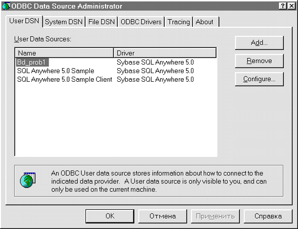 Для создания нового источника ODBC щелкните мышкой по пиктограмме 32bit ODBC или ODBC. Тогда на экране появится окно Администратора MicroSoft ODBC со списком уже имеющихся источников данных(рис. 14).