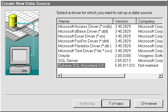 Рис. 15. Выбор ODBC-драйвера Sybase SQL Anywhere 5.0 Так как мы создаем источник данных для СУБД SYBASE SQL Anywhere, то следует выбрать драйвер Sybase SQL Anywhere 5.0. Чтобы подтвердить сделанный выбор, щелкните мышкой по кнопке Готово. После этого вашему вниманию будет представлено диалоговое окно SQL Anywhere ODBC Configuration для задания характеристик создаваемого источника данных (рис. 16).