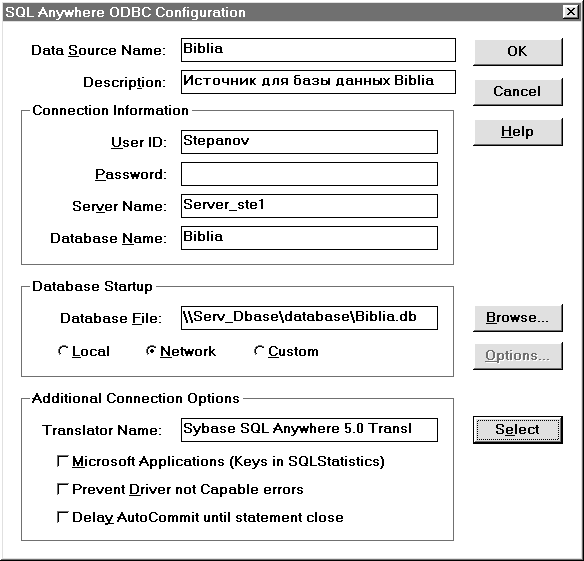 Рис. 17. Диалоговое окно Startup Options В данном окне поля Start Command, Database Switches и флажок Autostop Database предназначены для определения параметров DatabaseSwitches, Start и AutoStop, соответсвенно. Область Agent служит для задания значения одноименного параметра соединения. Поле Isolation Level не предназначено для параметров соединения. Оно служит для ввода значения параметра функционирования базы данных Isolation_level (уровня изолированности). Этот параметр характеризует степень обеспечения целостности данных при работе с базой данных в режиме коллективного доступа. Параметр Isolation_level может принимать значения 0, 1, 2 или 3. По умолчанию значение этого параметра равно 0. Продолжим анализировать характеристики ODBC-драйвера (см. рис. 16). Следует отметить, что ввод значений в поля User Id и Password не является обязательным. Более того это не желательно. Если имя и, особенно пароль, определены в источнике данных, то они могут быть беспрепятственно считаны другими пользователями. Это может привести к возможности несанкционированного доступа, а затем и к непредсказуемым последствиям. Если значения параметров соединений Userid и Password в источнике данных не заданы, тогда ввод их осуществляется при соединении с базой данных. Рассмотрим область Additional Connection Options. Иногда при использовании источника данных возникает необходимость преобразования данных символьных типов из ANSI-кодировки (для Windows) в OEM-кодировку (для DOS) и обратно. Тип конвертора для этого случая задается в поле Translator Name. Выбор конвертора осуществляется при помощи кнопки Select. Из рис. 16 видно, что источник данных Biblia предназначен для связи приложений пользователя Stepanov с базой данных Biblia, управляемой удаленным сервером Server_ste1. При использовании созданного источника данных будет производиться преобразования символов из ANSI-кодировки в OEM-кодировку и обратно. После установления соединения ворота, преграждавшие путь к данным, открыты. Вам остается пройти через них и начать свое путешествие по лабиринтам хранилища информации. Назад | Содержание | Вперед