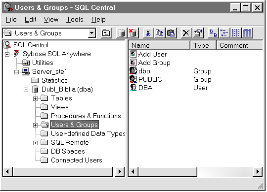 Для хранимых процедур и функций определена только одна привилегия - EXECUTE. Она предоставляет пользователю возможность запускать хранимые процедуры или функции. Для представлений могут быть установлены привилегии DELETE, INSERT, SELECT и UPDATE. Назначение этих такое же как и у одноименных привилегий таблиц данных, за исключением того, что привилегии SELECT и UPDATE не могут быть установлены для отдельных полей представлений. Привилегии могут быть как индивидуальными, так и групповыми. Индивидуальные привилегии устанавливаются для отдельных пользователей, а групповые - для групп пользователей. Рассмотрим процедуру регистрации индивидуальных пользователей и групп пользователей на примере ранее созданной базы данных Dubl_Biblia. Произведем регистрацию администратора базы данных и пользователей - библиотекарей. В качестве администратора назначим пользователя Степанова Ю.Л., а библиотекарями - пользователей Петрову Ю.П., Иванову С.В., Сидорову О.К. и Попову И.Н. Назначим им следующие пользовательские имена: Stepanov, Petrova, Ivanova, Sidorova и Popova, соответственно. ПРИМЕЧАНИЕ Регистрацию как отдельных пользователей, так и групп пользователей может производить только пользователь с правами администратора базы данных. Сначала рассмотрим как эта процедура выполняется в утилите SQL Central. Для ее проведения необходимо произвести соединение с базой данных. Пока в базе данных Dubl_Biblia хранится информация только о пользователе DBA, имеющего пароль SQL. Под его именем и подключимся к базе данных. Зарегистрируем сначала администратора базы данных Dubl_Biblia - пользователя под именем Stepanov. Для этого раскройте папку Users & Groups (рис. 34). В результате в левой панели будут отображены имена всех зарегистрированных индивидуальных пользователей и названий групп пользователей.