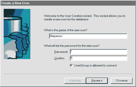 Рис.35. Начало регистрации нового пользователя базы данных Пояснение. Добро пожаловать в Мастер регистрации пользователей. Этот мастер позволяет вам осуществить регистрации нового пользователя базы данных. Вопрос 1. Под каким именем вы хотите зарегистрировать нового пользователя? Ниже следует поле, в которое следует ввести имя пользователя. В нашем случае это имя Stepanov. Вопрос 2. Какой пароль вы хотите присвоить новому пользователю? Текст пароля вводится в поле Passworsd. В поле Confirm необходимо подтвердить пароль. В рассматриваемом случае в качестве пароля используется символ s. Флажок User/Group is allowed to connect определяет право соединения регистрируемого пользователя с базой данных. В рассматриваемой версии SYBASE SQL Anywhere регистрация пользователей, не имеющих такого права, не имеет смысла. Этой флажок остался от предыдущих версий. После выполнения предлагаемых действий щелкните мышью по кнопке Далее для выполнения следующего шага. Шаг 2. Выбор класса полномочий (рис. 36).