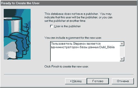 Рис.37. Подтверждение регистрации нового пользователя Пояснение. В используемой базе данных не зарегистрирован издатель. Вы можете зарегистрировать данного пользователя в качестве издателя или сделать это в любое другое время. Флажок User is the publisher позволяет зарегистрировать пользователя как издателя в процессе репликации данных. В большом поле в центре окна вы можете записать соответствующий комментарий. Все действия выполняемый в шагах 1- 3, являются подготовительными. Их цель состояла в формировании параметров для SQL-операторов, осуществляющих регистрацию пользователей. Для подтверждения правильности ранее введенных параметров нажмите кнопку Готово. После этого произойдет окончательное формирование соответствующих SQL-операторов, которые будут отправлены на сервер. В случае успешного их выполнения сервером, в базе данных будет зарегистрирован пользователь Stepanov. Таким образом в базе данных теперь имеется два пользователя с полномочиями администратора базы данных. Теперь в базе данных Dubl_Biblia имеется информация о ее администраторе - пользователе Stepanov. Для регистрации в качестве пользователей библиотекарей (пользователей Petrova, Ivanova, Sidorova и Popova) проведем аналогичные действия. В качестве пароля для каждого из библиотекарей будем использовать первую букву в имени пользователя. Единственное отличие состоит только в том, для библиотекарей не будет определено никаких классов полномочий. В результате этого в базе данных будет зарегистрировано еще 4 пользователя (см. рис. 38).