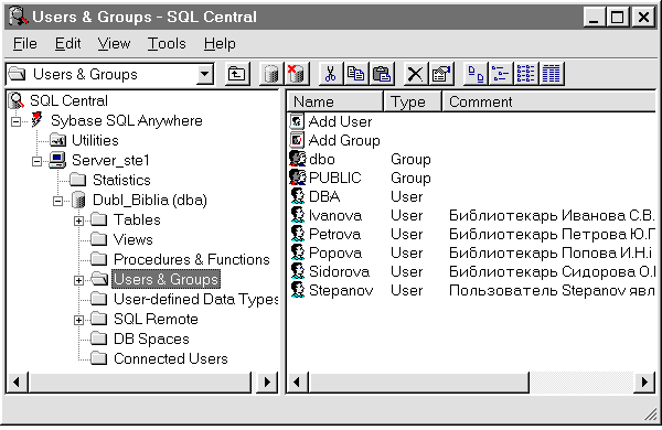 Рис.38. Обновленный состав пользователей базы данных Для библиотекарей не был установлен класс полномочий DBA. По этой причине при их подключении в утилите SQL Central к базе данных Dubl_Biblia будет выдаваться предупреждение. Оно гласит от том, что пользователь не является администратором базы данных, в связи с чем доступ его к отдельным папкам утилиты будет ограничен. Регистрация пользователей в среде утилиты ISQL осуществляется выполнением SQL-операторов GRANT. Для того, чтобы зарегистрировать пользователя c именем Stepanov как администратора базы данных необходимо выполнить следующую последовательность SQL-операторов: /* Регистрация пользователя "Stepanov" с паролем "s", с предоставлением ему права соединения с базой данных */ GRANT CONNECT TO Stepanov IDENTIFIED BY s; /* Установление пользователю "Stepanov" класса полномочий DBA */ GRANT DBA TO Stepanov; /* Установление пользователю "Stepanov" класса полномочий Remote dba */ GRANT Remote DBA TO Stepanov; /*Определение комментария для пользователя "Stepanov"*/ COMMENT ON USER Stepanov IS 'Пользователь Stepanov является администратором базы данных Dubl_Biblia' Для регистрации библиотекарей в качестве пользователей требуется выполнить следующие SQL-операторы: /* Регистрация пользователей - библиотекарей с предоставлением им права соединения с базой данных */ GRANT CONNECT TO Petrova IDENTIFIED BY p; GRANT CONNECT TO Ivanova IDENTIFIED BY i; GRANT CONNECT TO Sidorova IDENTIFIED BY s; GRANT CONNECT TO Popova IDENTIFIED BY p; /*Определение комментария для пользователей - библитотекарей */ COMMENT ON USER Petrova IS 'Библиотекарь Петрова Ю.П. '; COMMENT ON USER Ivanova IS 'Библиотекарь Иванова С.В.'; COMMENT ON USER Sidorova IS 'Библиотекарь Сидорова О.К.'; COMMENT ON USER Popova IS 'Библиотекарь Попова И.Н.' Если вы не можете воспользоваться утилитой SQL Central, убедиться в том, регистрация пользователей была успешно осуществлена можно и в среде утилиты ISQL. Для этого следует считать информацию из системного представления SYS.SYSUSERLIST, что можно сделать путем выполнения следующего запроса: /* Получение информации о зарегист- рированных пользователях в ISQL */ SELECT * FROM SYS.SYSUSERLIST Пользователи базы данных могут быть объединены в группы. Необходимость создания групп обусловлена удобством управления привилегиями пользователей. Дело в том, что эта процедура, применяемая в отдельности к каждому из индивидуальных пользователей, является весьма утомительной. Особенно остро это ощущается при большом количестве пользователей и необходимости быстро изменить их права. Для решения этой задачи применяется объединение равноправных пользователей в группы. Точно также решаются данный вопрос и других системах, где защита от несанкционированного доступа имеет большое значение. Например, именно так обстоит дело в многопользовательских операционных системах, базах данных и вычислительных сетях. При этом на уровне группы легко меняются привилегии пользователей-членов групп. Такие пользователи имеют как индивидуальные, так и групповые привилегии. Индивидуальные привилегии устанавливаются для отдельных пользователей, а групповые - для групп пользователей. В отличие от привилегий, классы полномочий в SYBASE SQL Anywhere устанавливаются только индивидуально, для каждого пользователя в отдельности. Для удобства управления привилегиями пользователей в базе данных Dubl_Biblia, объединим всех библиотекарей в группу пользователей LIBRARIANS (библиотекари). Для образования новой группы пользователей в SQL Central необходимо использовать мастер Add Group (см. рис. 38). Это