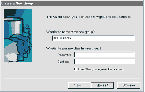Рис.39. Начало создания новой группы пользователей базы данных Пояснение. Этот мастер позволяет вам создать новую группу пользователей базы данных. Вопрос 1. Под каким именем вы хотите создать новую группу пользователей? Ниже следует поле, предназначенное для задания наименования группы пользователей. Для библиотекарей мы создаем группу LIBRARIANS. Вопрос 2. Какой пароль вы хотите присвоить новой группе? В рассматриваемой версии при создании группы пользователей поля Passworsd и Confirm, а также флажок User/Group is allowed to connect не имеют никакого значения. Их значения не считываются .Эти элементы являются наследством предыдущих версий. По этой причине оставляет вышеуказанные поля не заполненными и снимаем флажок User/Group is allowed to connect. Шаг 2 и шаг 3 данного мастера точно такие же как и у мастера Add user. (см. рис. 36, 37). Кроме комментария в шаге 3, остальные данные на этих шагах не имеют смысла. В связи с этим в шаге 2 сразу "нажмем" на копку Далее. Наличие данных бессмысленных шагов объясняется наследственностью предыдущих версий. После завершения работы с мастером Add Group в базе данных появляется еще одна группа пользователей - группа LIBRARIANS. При этом в папку Users & Groups (см. рис. 38) будет добавлена пиктограмма группы пользователей - LIBRARIANS. Для того, чтобы создать такую группу пользователей в утилите ISQL требуется выполнить следующие SQL-операторы: /* Регистрация нового пользователя LIBRARIANS без определения пароля /* GRANT CONNECT TO LIBRARIANS; /* Установка класса полномочий Remote DBA, т. к. в шаге 2 сразу перешли к следующему шагу */ GRANT Remote DBA to LIBRARIANS; /* Предоставление пользователю возможности иметь подчиненных пользователей*/ GRANT GROUP TO LIBRARIANS; COMMENT ON USER LIBRARIANS IS 'Группа библиотекарей' Для того, чтобы удостовериться в утилите ISQL в том, что группа LIBRARIANS была создана и она пока не объединяет ни одного пользователя необходимо считать информацию из системных представлений SYS.SYSUSERLIST и SYS.SYSGROUPS. Как видно из вышерассмотренных SQL-операторов, группы пользователей фиксируются в базе данных таким же образом как и индивидуальные пользователи. Однако отсутствие пароля не дает возможность осуществить соединение с использованием в качестве имени пользователя наименования группы. Только что созданная группа LIBRARIANS не объединяет пока ни одного пользователя. Включим в ее состав зарегистрированных библиотекарей. В SQL Central для выполнения этой задачи следует выделить пиктограмму пользователя, включаемого в группу, и удерживая левую кнопку мыши перетащить ее к пиктограмме группы. Объединим таким образом всех библиотекарей в группу LIBRARIANS. После этого щелкнем мышью по пиктограмме LIBRARIANS. Тогда в правой панели утилиты будет показан состав группы пользователей LIBRARIANS (рис. 40). При этом в левой для дальнейших рассуждений раскрыта вся иерархия групп пользователей.
