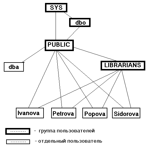 Рис.40. Состав группы пользователей LIBRARIANS В утилите ISQL такого же эффекта позволяет достичь выполнение ниже приведенных SQL-операторов: /*Включение пользователей - билиотекарей в группу LIBRARIANS */ GRANT MEMBERSHIP IN GROUP LIBRARIANS TO Ivanova; GRANT MEMBERSHIP IN GROUP LIBRARIANS TO Petrova; GRANT MEMBERSHIP IN GROUP LIBRARIANS TO Popova; GRANT MEMBERSHIP IN GROUP LIBRARIANS TO Sidorova Проверить результаты включения библиотекарей в группу LIBRARIANS в среде ISQL можно, обратившись к системному представлению SYS.SYSGROUPS. Теперь привилегии, устанавливаемые для группы LIBRARIANS, автоматически распространяются на всех пользователей - библиотекарей, входящих в группу. Любой отдельный пользователь, также как и группа пользователей, может входить в состав нескольких групп. В свою очередь каждая группа может включать в качестве своих членов несколько пользователей и групп. Члены группы наследуют привилегии, установленные во всех группах, в которые они входят. При создании базы данных в ней автоматически создаются три пользовательские группы: SYS, dbo и PUBLIC. О них коротко упоминалось при рассмотрении утилиты ISQL (см. рис. 22) и при обсуждении создания базы данных (см. рис. 34). Группа SYS выступает как владелец всех системных таблиц и представлений. (Следует напомнить, что владельцами объектов являются пользователи их создавшие.) Группа dbo введена в состав баз данных СУБД SQL Anewhere для обеспечения совместимости с базами данных СУБД SYBASE SQL Server. Эта группа является владельцем представлений, созданных на основе системных таблиц и представлений. Представления группы dbo имеют такие же названия, содержат те же поля и хранят такую же информацию, что и одноименные системные таблицы и представления СУБД SYBASE SQL Server. В объектах, владельцами которых являются группы SYS и dbo, хранится вся служебная информация о базе данных. В пользовательскую группу PUBLIC входят все регистрируемые в базе данных отдельные пользователи и группы пользователи. Пользователи включаемые затем в другие группы тем не менее остаются членами группы PUBLIC. В этой группе установлена привилегия SELECT (см. табл. 7) для некоторых системных таблиц и всех системных представлений. Поэтому любой пользователь имеет возможность считать некоторую информацию о базе данных. В базах данных СУБД SQL Anywhere информация о вхождении отдельных пользователей и групп пользователей в состав других групп хранится в системном представлении SYS.SYSGROUP. На основании информации из этого представления составлена схема взаимосвязей групп пользователей для базы данных Dubl_Biblia (рис. 41).