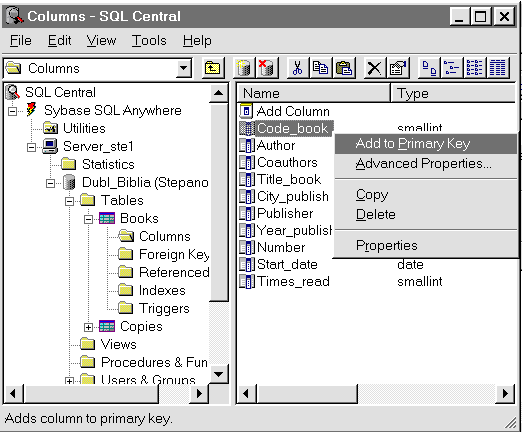 Некоторые свойства полей были рассмотрены в п.5.4, остальные - будут рассмотрены ниже. Свойства таблиц будут предметом рассмотрения п.5.6. В утилите SQL Central разработчики вынесли в окна редактора структуры таблиц наиболее часто используемые свойства полей (см. рис. 42). Доступ к остальным свойствам осуществляется через меню или панель инструментов редактора. Другим способом установить вышеуказанные свойства можно, используя контекстные меню полей и таблиц. Эти меню появляются после щелчка правой кнопкой мыши по соответствующему полю или таблице. В утилите ISQL определение свойств таблиц и ее полей осуществляется при помощи SQL-операторов Create Table и Alter Table. Установим дополнительные свойства полей в таблице Books базы данных Dubl_Biblia. Как было показано в п.5.4, эта таблица была создана путем копирования ее структуры из исходной таблицы базы данных Biblia. В создаваемую таким образом таблицу дополнительные свойства полей и свойства таблицы из исходной не переписываются. В связи с этим данные свойства необходимо установить принудительно. В таблице Books следует определить поле Code_book первичным ключом и показать как устанавливаются значения, присваиваемые этому полю по умолчанию. Для этого воспользуемся контекстным меню. ПРИМЕЧАНИЕ Изменять свойства полей таблицы имеют возможность ее владелец, пользователи с классом полномочий DBA и пользователи, для которых для работы с таблицей установлена привилегия ALTER (см. табл. 7). Подключитесь к базе данных Dubl_Biblia в утилите SQL Central для установления дополнительных свойств полей таблицы Books. Отобразите в правой панели перечень ее полей. Последовательно раскройте содержимое папок Tables, Books и Columns. Выделите поле Code_book и щелкните по нему правой кнопкой мыши. В результате этого появится контекстное меню (рис. 45).